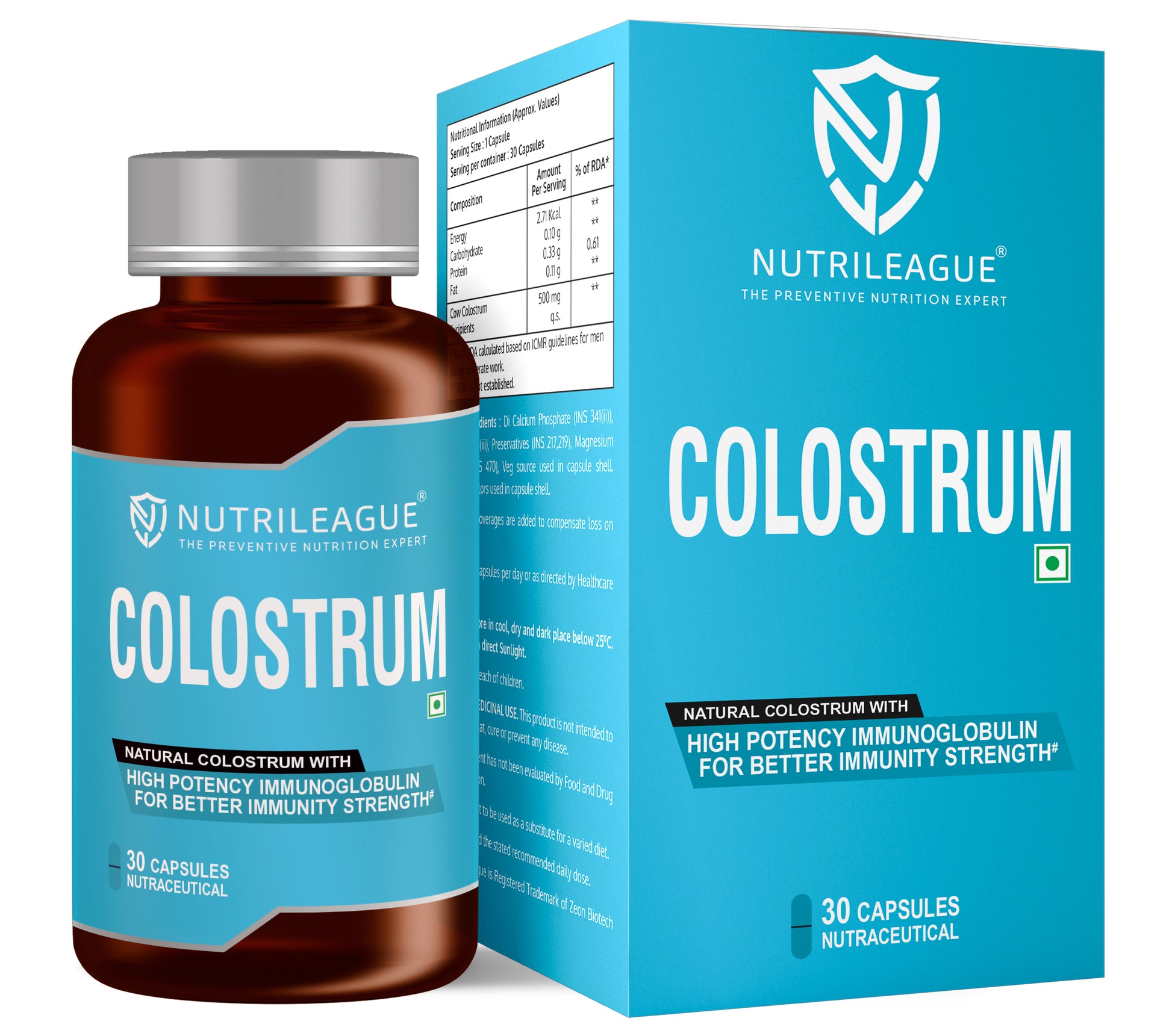 Nutrileague Colostrum Capsules are derived from fresh cow milk. Cow colostrum is naturally nutrient-rich and has vital contains like casein protein & carbohydrates. The added benefit of minerals and vitamins from the cow colostrum helps the body fight against any internal bacterial or viral development. The digestive enzymes help the body process and filter food better, resulting in less fat deposits and a better respiratory system. Apart from these vital nutrients, Nutrileague Colostrum Capsules also contain antibodies in the form of immunoglobulins and important growth hormones that stimulate growth.